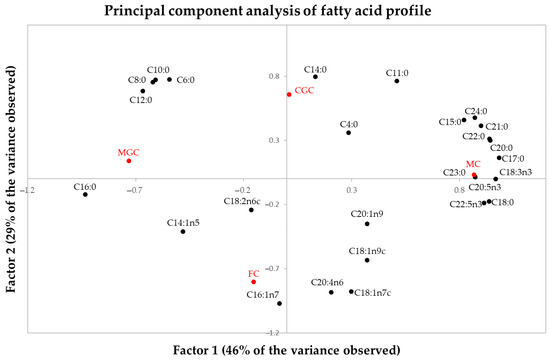 Distribution of the percentages of fatty acids in the map configured by the first two principal components. CGC = Cabra del Guadarrama Cheese; MC = Malagueña Cheese; MGC = Murciano-Granadina Cheese; FC = Florida Cheese. The position of the studied cheeses is shown in red lettering.