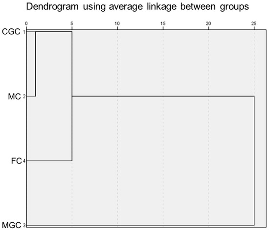 Dendrogram of goat cheeses made from the milk of different autochthonous goat breeds. CGC = Cabra del Guadarrama Cheese; MC = Malagueña Cheese; MGC = Murciano-Granadina Cheese; FC = Florida Cheese.