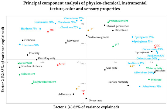 In this study, moisture exhibited a strong positive correlation with adhesiveness at 50% and 75% compression (r = 0.980 and r = 0.977, respectively). Additionally, at 50% compression, moisture exhibited a negative correlation with hardness (Table S1). The literature describes a positive relationship between cohesiveness and cheese moisture, such that the higher the water content, the greater the force exerted by the internal bonds of the cheese [50]. In this sense, CGC had a higher moisture content and therefore greater cohesiveness. However, MC, which had the lowest moisture content, had higher values of hardness and lower values of springiness than the other cheeses. Furthermore, aw was positively correlated with hardness (r = 0.987) and adhesiveness (r = 0.989). On the other hand, hardness at 50% showed a negative correlation with adhesiveness (r = −0.999, p ≤ 0.01) and cohesiveness (r = −0.915). CGC had the highest bond strength and the lowest hardness. Cohesiveness showed a positive correlation with adhesiveness (r = 0.930, p > 0.05) and springiness (r = 0.980, p < 0.05) (Table S1). In general, in our study, springiness, cohesiveness or resilience were the parameters that showed the least variation from one cheese to another. However, other parameters such as hardness or gumminess showed more variability.