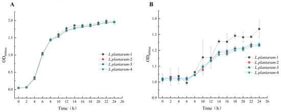 Figure 2. Growth characteristic curves of L.plantarum in MRS broths (A) and in apple juice (B). Three biologically independent replicates were performed to construct growth curves for each isolate.