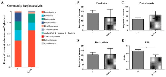 Figure 4. Effect of fermented apple juice on gut flora phylum levels: (A) heatmap of phylum level; (BD) relative abundance of Firmicutes, Proteobacteria, and Bacteroidota; and (E) ratio of Firmicutes/Bacteroidota; “O” denotes the obesity group, “O+FAJ” denotes fermented apple juice group; * denotes significant difference.