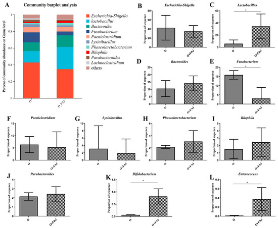 Figure 5. Effect of fermented apple juice on gut flora genus levels: (A) heatmap of genus level; (BL) the relative abundance of Escherichia-Shigella, Lactobacillus, Bacteroides, Fusobacterium, Paeniclostridium, Lysinibacillus, Phascolarctobacterium, Bilophila, Parabacteroides, Bifidobacterium, and Enterococcus; “O” denotes obese group, “O+FAJ” denotes fermented apple juice group, and * denotes significant difference.