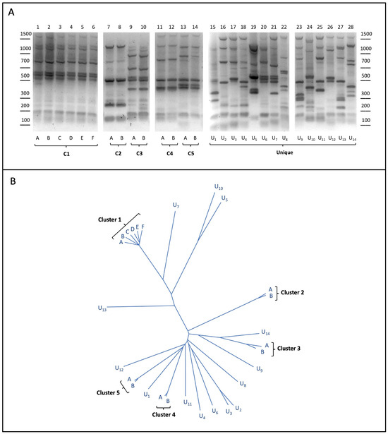 A subset of twenty-eight yeast strains from the collection were analyzed by the inter-delta PCR assay, commonly used to perform S. cerevisiae genotyping, as already reported [10,34,35]. As shown in Figure 1A, our analysis for the twenty-eight strains unveiled nineteen different banding patterns, indicating that some strains (U1–U14) were characterized by specific (unique) inter-delta profiles, whereas common, yet different, patterns were shared by two (or more) of the other fourteen strains. The comparison between their inter-delta profiles finally resulted in the definition of five yeast clusters composed by either multiple (C1) or two (C2–C5) different strains.