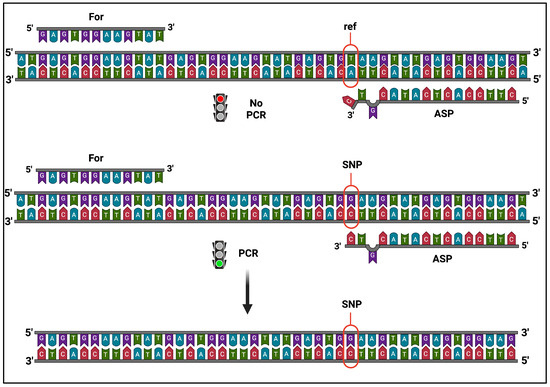 Schematic view of the AS-PCR experimental strategy. PCR amplification by AS primer (ASP) can only occur if the template DNA carries the variant allele (SNP), producing specific DNA fragments, but does not start with the reference sequence (ref). Image was created with BioRender.com.
