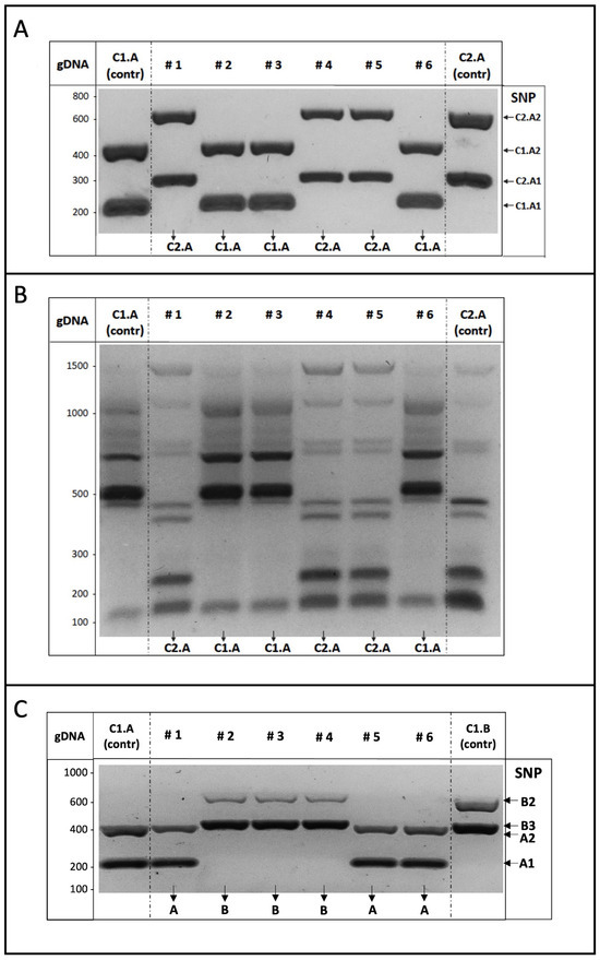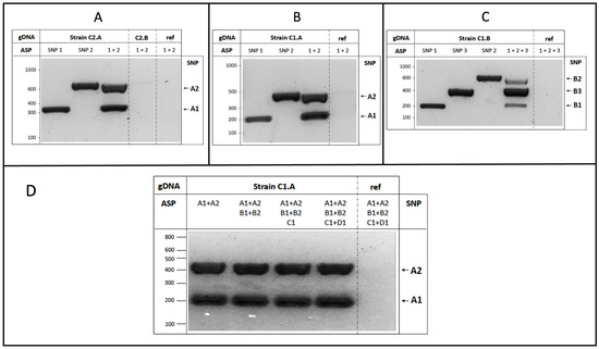 We then focused on the SNPs identified for the strains belonging to cluster 1. We started with the C1.A strain, confirming that both SNP1 and SNP2 were able to discriminate the strain, as indicated by the presence of DNA amplification fragments in uni- and multiplex AS-PCRs only in the presence of C1.A genomic DNA as the template (Figure 3B).
