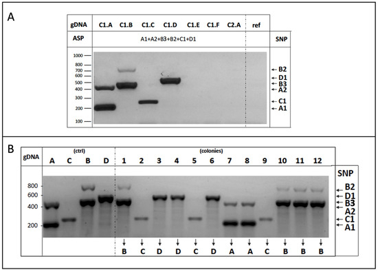 Once the experimental reaction conditions were optimized (e.g., TA, see Materials and Methods Section 2), the use of AS primers was expected to allow the DNA amplification of the different strain-specific markers (SNPs), irrespective to their homo- or heterozygosity, distinguishing them from the common allele considered as a reference. The AS-PCR reactions were performed by combining one or more pairs of primers (respectively, uni- and multiplex AS-PCR) to amplify one (or more) of the identified strain-specific variants. The products of the AS-PCR reactions were then subjected to electrophoretic separation in agarose gel, and the DNA fragments observed upon proper staining.