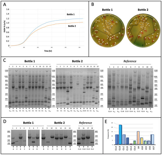 (A) Fermentation kinetics. Two independent bottles (1 and 2) containing white wine added to 25 g/L of fructose were inoculated with a mixture of eleven yeast strains leading to substrate fermentation. Ethanol production was constantly monitored for 22 days and finally represented as kinetic curves for each bottle. (B) Colony isolation. WL nutrient agar plates were used to isolate S. cerevisiae cells by spreading selected dilutions from bottles 1 and 2. After incubation for 48 h at 28 °C, thirteen colonies were randomly selected from a plate of each bottle. (C) Genotyping by inter-delta analysis. Genomic DNA purified from each indicated yeast colony was used as a template in the inter-delta PCR assays. Each colony (lanes 1–13) was isolated from bottles 1 (left) and 2 (middle); gDNA from pure strains was used as a reference for pattern comparison (right). DNA products were subjected to agarose gel separation and visualized upon staining. (D) Genotyping by multiplex AS-PCR assay. Genomic DNA from the fourteen colonies (1–14) assigned to cluster 1 were used as a template in the multiplex AS-PCR assay to amplify the strain-specific SNPs (as in Figure 5B). Colony identity was assigned by profile comparison with the four reference strains on the right. (E) Distribution frequence (%) of the yeast strains during the stress test. Data from inter-delta and multiplex AS-PCR assays were combined to establish the frequence of yeast strains upon colony genotyping.
