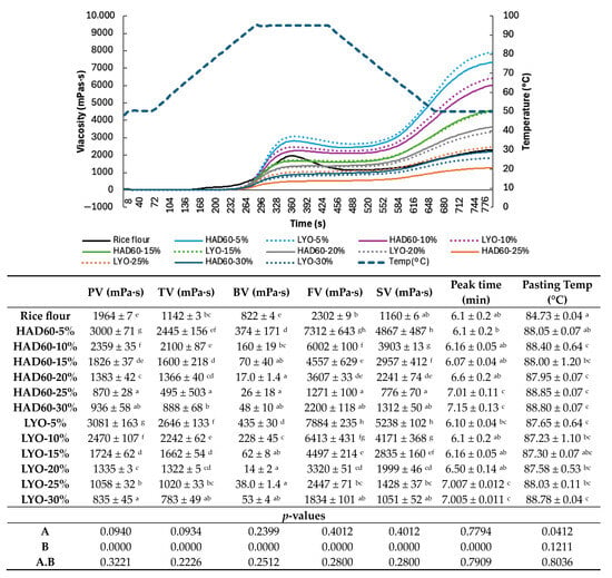 Pasting curves, pasting temperature, and the pasting behaviour of rice flour (control) and flour blends in which rice flour was partially replaced with almond bagasse powder, hot air-dried at 60 °C (HAD60) or lyophilised (LYO), at substitution levels of 5–30%. PV: peak viscosity; TV: trough viscosity; BV: breakdown viscosity; FV: final viscosity; SV: setback viscosity. (A) Treatment; (B) replacement percentage. The results represent the mean of three repetitions. Different lowercase letters indicate significant differences (p ≤ 0.05) among the different flours.