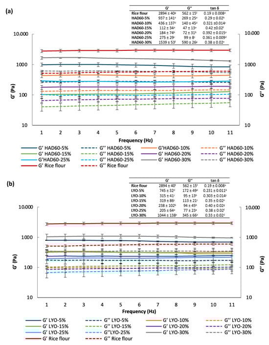 Elastic modulus (G′) and viscous modulus (G″) of rice flour (control) and of flour blends in which rice flour was partially replaced with almond bagasse powder, hot air-dried at 60 °C (HAD60) (a) or lyophilised (LYO) (b), at substitution levels of 5–30%. The results represent the mean of three repetitions. Different lowercase letters indicate significant differences (p ≤ 0.05) among the different flours.