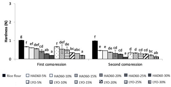 Gel hardness (N) of samples prepared from rice flour (control) and from flour blends in which rice flour was partially replaced with almond bagasse powder, hot air-dried at 60 °C (HAD60) or lyophilised (LYO), at substitution levels of 5–30%. All samples were hydrated, heated, and cooled to allow gel formation prior to analysis. The results represent the mean of three repetitions. Different lowercase letters indicate significant differences (p ≤ 0.05) among the different flours.
