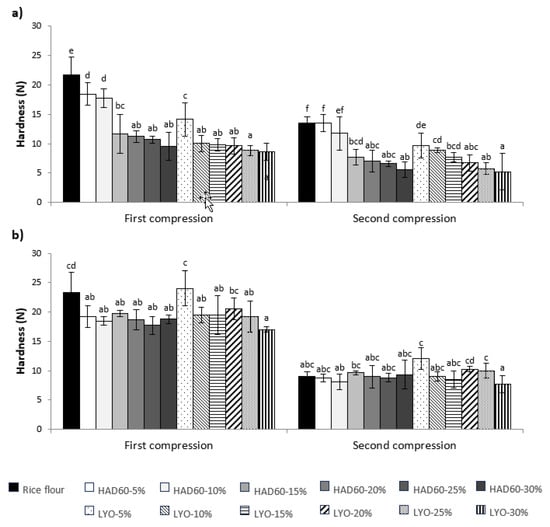 Hardness (N) of fresh (a) and 7-day stored (b) bread made from rice flour (control) and flour blends in which rice flour was partially replaced with almond bagasse powder, hot air-dried at 60 °C (HAD60) or lyophilised (LYO), at substitution levels of 5–30%. The results represent the mean of three repetitions. Different lowercase letters in each compression indicate significant differences (p ≤ 0.05) among the different bread formulations.