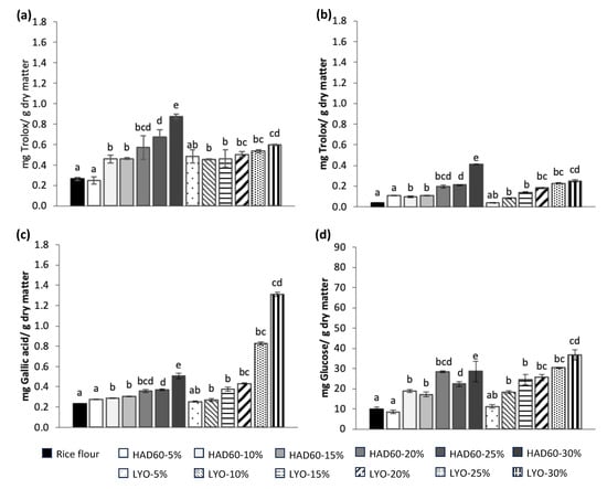 Antioxidant activity determined by (a) DPPH and (b) FRAP methods; (c) total phenol content; and (d) reducing sugars in samples prepared from rice flour (control) and from flour blends in which rice flour was partially replaced with almond bagasse powder, hot air-dried at 60 °C (HAD60) or lyophilised (LYO), at substitution levels of 5–30%. The results represent the mean of three repetitions. Different lowercase letters indicate significant differences (p ≤ 0.05) among the different flours.