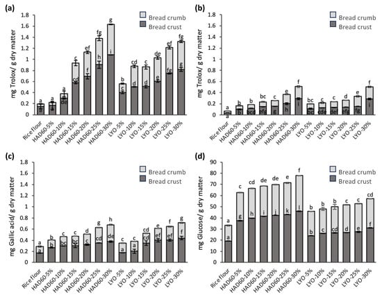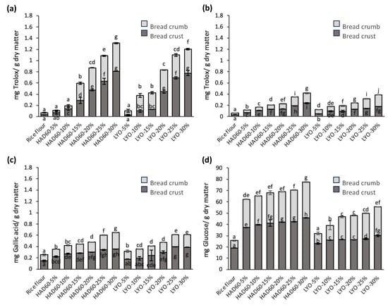 Antioxidant activity determined by (a) DPPH and (b) FRAP methods; (c) total phenol content; and (d) reducing sugars in the crumb and crust of fresh bread made from rice flour (control) and flour blends in which rice flour was partially replaced with almond bagasse powder, hot air-dried at 60 °C (HAD60) or lyophilised (LYO), at substitution levels of 5–30%. The results represent the mean of three repetitions. Different lowercase letters within each bread fraction (crumb or crust) indicate significant differences (p ≤ 0.05) among the different bread formulations.