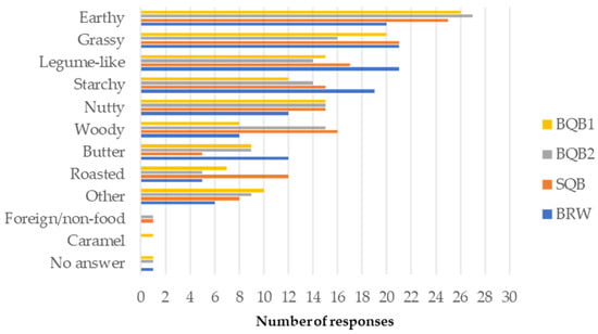 - Descriptive Sensory Attributes: Aromas and flavor profiles of products such as beer [56], Canadian maple products [57], and coffee [58] have been systematically characterized and represented through flavor wheels to support sensory quality assessment across diverse commercial products. Nevertheless, no standardized descriptive lexicon currently exists for the sensory evaluation of pseudocereals, including quinoa. Figure 1 presents the frequency of flavor descriptors associated with each sample. The most frequently selected terms for cooked quinoa were earthy, grassy, legume-like, and starchy. Compared to the Québec samples, BRW was more commonly associated with starchy and legume-like notes and less frequently with nutty notes. In contrast, SQB, BQB1, and BQB2 were more frequently described as earthy. BQB2 was perceived as the least grassy, while both BQB2 and SQB were more often associated with woody notes. Finally, SQB was uniquely characterized by a roasted flavor. These results support previous findings reporting a significant impact of quinoa variety on aroma attributes such as caramel, nutty, buttery, grassy, earthy, and woody [27]. It was also noted in that study that consumers preferred a grassier aroma and a less woody aroma. However, this does not align with the results of the present study since BRW and BQB2 received similar overall appreciation despite BQB2 having less frequent mention of grassy and more of woody aroma. Other flavors more frequently identified in BQB2 compared to BRW, such as earthy and nutty, may have contributed to its favorable rating. Repeated sensory evaluations and expert judges could help in providing descriptors for these new Canadian crops.