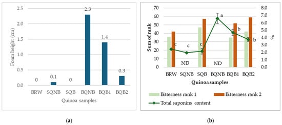 (a) Saponins content estimated in quinoa samples using afrosymetric method, expressed in foam height (cm), where samples with a foam height of 1.0 cm or less can be considered as “sweet” [25]. (b) Comparison between bitterness rankings sensory tests and total saponins content (measured using UV–vis spectrophotometry method). ND, not determined for bitterness ranking test. (Samples: BRW, Bolivian Royal White; SQNB, Sweet quinoa non-brushed; SQB, Sweet quinoa brushed; BQNB, Bitter quinoa non-brushed; BQB1, Bitter quinoa brushed once; BQB2, Bitter quinoa brushed twice). Different letters represent significant differences (p < 0.05).