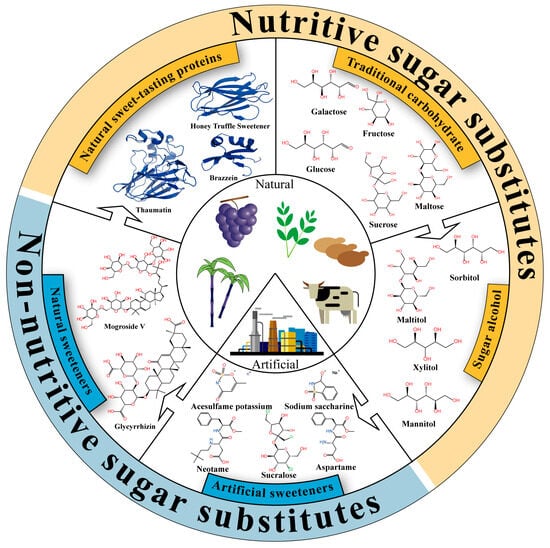 Sweeteners are classified into five categories based on their structural types and developmental trends: traditional carbohydrates, sugar alcohols, artificial sweeteners, natural non-nutritive sweeteners, and natural nutritive sweet-tasting proteins (Figure 1). Table 1 provides a detailed overview of the classification, characteristics, and sweetness descriptions of these sweet substances. Traditional carbohydrates play a vital role in food formulations. Over the past century, with continuous advancements in breeding, extraction, and purification technologies, the production of traditional carbohydrates has significantly increased, with annual sucrose output exceeding 180 million tons [13,14,15]. The sweetness range of traditional carbohydrates is typically between 0.25 and 1.5, characterized by a mild sweet taste and the absence of off-flavors. As traditional sugars permeate various aspects of modern daily life, researchers worldwide have begun to focus on the health implications of their excessive intake. For instance, high sucrose consumption has been shown to impair children’s memory and learning abilities [16], and sugar-sweetened beverages have been associated with an increased risk of obesity, as well as metabolic syndrome (including insulin resistance, dyslipidemia, elevated blood pressure, and impaired glucose metabolism) [17]. On the other hand, with economic and technological development, the rising incidence of epidemic obesity and diabetes has led to increased public attention to healthy eating. To meet this demand, the food industry has developed sugar alcohol sweeteners, such as xylitol and sorbitol. Although sugar alcohols share structural similarities with traditional sugars, their sweetness and caloric values are generally lower than those of sucrose. Moreover, sugar alcohols serve functions beyond sweetness, including flavor enhancement, coloring, and dental protection. For example, xylitol has been demonstrated to significantly improve oral health in young children by preventing dental caries, supporting enamel remineralization, and inhibiting dental plaque and gingivitis [18].