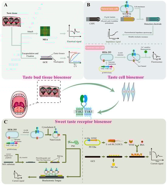 Current sweetness evaluation still largely depends on sensory analysis, including triangle tests and quantitative descriptive analysis [4]. Although international protocols have been established to improve consistency, sensory data often suffer from limited reproducibility due to variations in physiology, cognitive bias, and environmental conditions [5]. To address the limitations of human-based assessment, electronic tongue systems have been developed [6]. These systems use cross-sensitive sensor arrays to simulate taste perception and generate objective “taste fingerprints”. Despite their technical advantages, electronic tongues are limited by their inability to detect non-electroactive compounds and their insensitivity to the interaction between taste and smell, which reduces their applicability in complex food matrices [7]. The identification of the T1R2/T1R3 sweet taste receptor and its associated intracellular signaling pathways has provided a molecular foundation for a new generation of detection technologies [8]. These receptors are heterodimeric proteins embedded in the cell membrane, containing multiple domains capable of binding structurally diverse sweeteners [9]. Based on this molecular understanding, various biosensors have been developed using receptor–ligand interactions, including cell-based platforms expressing T1R2/T1R3 [10] and field-effect transistors functionalized with the venus flytrap domain of T1R2 [11]. These approaches allow for ultra-sensitive detection and the differentiation of sweetener subtypes, shifting the field from subjective evaluation toward objective molecular recognition.