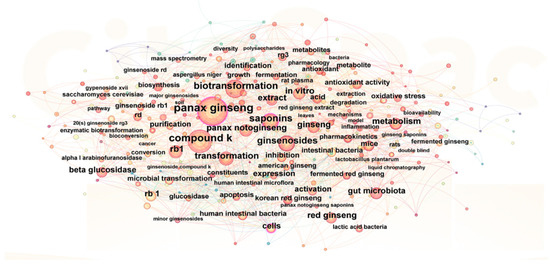 Co-occurrence network of keywords in ginseng fermentation researchers. Node size represents keyword frequency; the thickness of the lines connecting the nodes indicates the degree of association between the keywords.