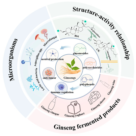 Biotransformation refers to the process of converting substrates into higher-value products through the utilization of biological catalysts, including enzymes, microorganisms, and animal or plant cells [100,101,102]. The predominant focus of microbial fermentation in ginseng processing is the biotransformation of ginsenosides. Through the process of microbial fermentation, the main ginsenoside in ginseng can be transformed into rare ginsenosides, which possess higher physiological activity. Furthermore, the impact of microbial fermentation on the structure–activity relationship of other bioactive substances, including polysaccharides and polyphenols, remains underexplored.