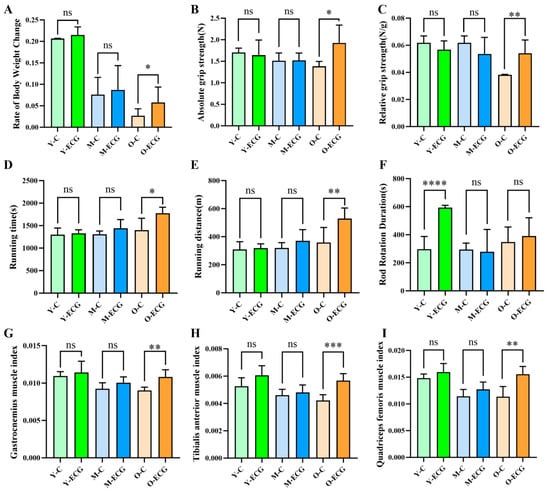 The assessment of muscle mass is quantified by the skeletal muscle index, defined as the ratio of muscle mass to body weight. Statistical analysis revealed that the gastrocnemius muscle index in the O-ECG group mice was 0.01082 ± 0.00098 (p = 0.0022), demonstrating a significant increase compared to 0.00902 ± 0.00043 in the O-C group (Figure 1G). Similarly, the tibialis anterior muscle index in the O-ECG group was 0.00568 ± 0.00051 (p = 0.0003), which was significantly higher than 0.00422 ± 0.00042 in the O-C group (Figure 1H). The quadriceps femoris muscle index in the O-ECG group was 0.01555 ± 0.00146 (p = 0.0016), showing a notable elevation compared to 0.01136 ± 0.00189 in the O-C group (Figure 1I). No significant changes in muscle indices were observed in juvenile and middle-aged mice.