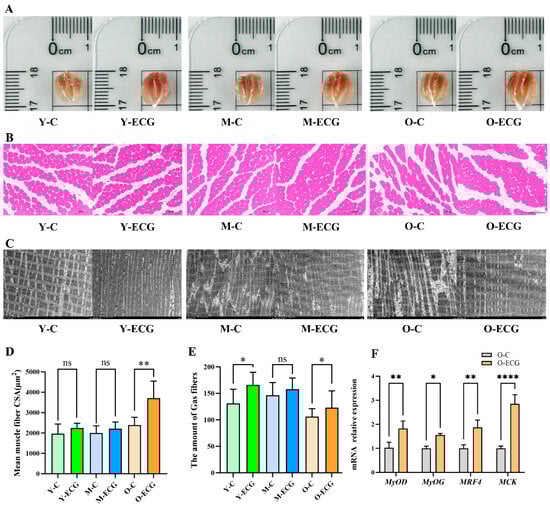 ECG significantly influences the morphology of skeletal muscle fibers in mice. (A) Samples of the gastrocnemius muscle from the mice are presented. (B) H&E staining illustrates the morphology of muscle fibers at 20× magnification. (C) Transmission electron microscopy is employed to observe the arrangement of muscle fibers in the mice. (D,E) ImageJ software was utilized for the statistical analysis of the average cross-sectional area and the number of muscle fibers in the mice. (F) The relative expression levels of mRNA for skeletal muscle differentiation-related genes in the mice are reported. Data are presented as mean ± standard deviation (n = 6). Data are expressed as mean ± standard deviation (n = 6). Compared to the control group, * p < 0.05, ** p < 0.01, **** p < 0.0001, ns > 0.05.