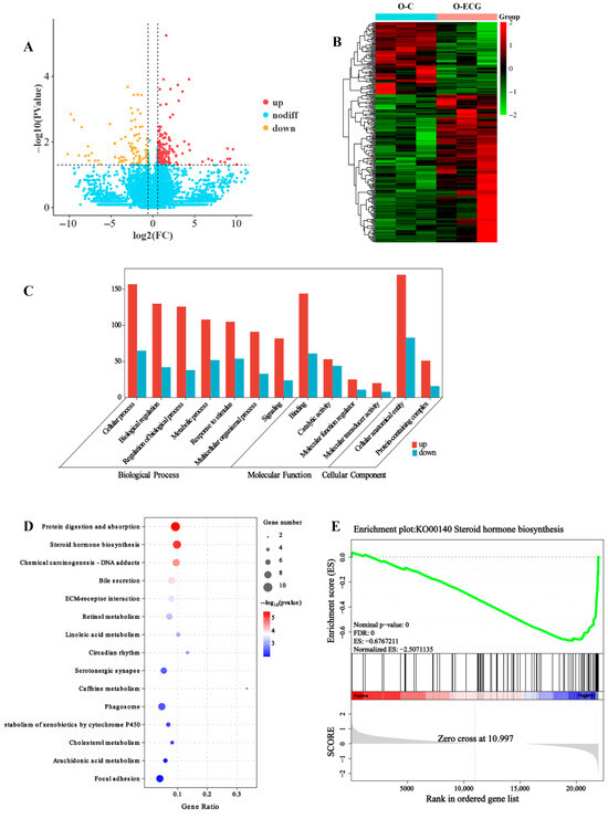 To further elucidate the primary enrichment signaling pathways associated with differentially expressed genes, KEGG pathway enrichment analysis was conducted. The results indicated that ECG-induced differentially expressed genes were significantly enriched in skeletal muscle-related pathways, including ECM-receptor interaction, bile secretion, and steroid biosynthesis pathways (Figure 3D). Additionally, Gene Set Enrichment Analysis (GSEA) was performed on the differentially expressed genes to assess the distribution trends of metabolic pathways during pathway enrichment. The findings revealed that among the differential genes regulated by ECG, the steroid biosynthetic pathway was the most prominent, ranking first in significance (Figure 3E).