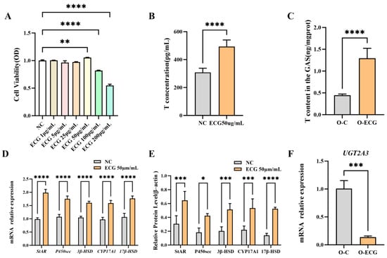 To verify the effect of ECG on promoting testosterone hormone synthesis, cell culture experiments were conducted. The experimental results indicate that after 24 h of treatment with ECG, the viability of TM3 cells in the 50 μg/mL treatment group was significantly higher than that of the control group (p = 0.0060). Conversely, the cell viability in the 100 μg/mL and 200 μg/mL treatment groups was significantly lower than that in the control group (p = 0.0001). These findings demonstrate that a 50 μg/mL concentration of ECG significantly promotes the proliferation of TM3 cells, while 100 and 200 μg/mL concentrations significantly inhibit their proliferation (Figure 4A). Consequently, a concentration of 50 μg/mL ECG was selected for further testing.