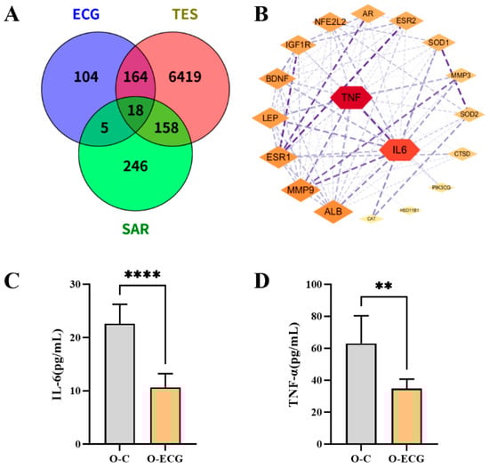 Network pharmacology target prediction and validation. (A) Venn diagram of target intersection genes. (B) PPI network diagrams of ECG, testosterone, and sarcopenia. (C,D) Concentrations of pro-inflammatory factors in mouse serum. Data are expressed as mean ± standard deviation (n = 6). Compared to the O-C group, ** p < 0.01, **** p < 0.0001.