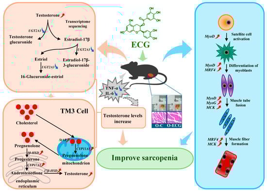 In this cell experiment, treatment of TM3 cells with 50 μg/mL ECG significantly increased the testosterone content and the expression of testosterone synthetase genes, including StAR, P450scc, 3β–HSD, CYP17a1, and 17β–HSD, as well as their corresponding protein levels in TM3 cells (Figure 4D,E). These findings suggest that appropriate concentrations of ECG can enhance testosterone synthesis by upregulating the expression of genes related to testosterone synthesis enzymes. Interestingly, the levels of muscle steroid hormones were significantly correlated with muscle strength and CSA [42]. This experiment demonstrated that testosterone levels in the gastrocnemius muscle of mice administered ECG significantly increased (Figure 4C). The exogenous supplementation of ECG appears to enhance the levels of skeletal muscle steroid hormones and may contribute, to some extent, to increases in muscle strength and CSA. Related studies have demonstrated that supplementing with Qiang Juice Tablets can regulate the expression of CYP11A1 and CYP17A1, thereby alleviating the compensatory expression of StAR and 3β-HSD in rat testicles. This regulation helps restore and maintain testosterone secretion levels to normal in elderly rats [43]. Furthermore, natural plant extracts have shown significant potential in enhancing the viability of testicular interstitial cells [44]. Both in vitro and in vivo tests indicate that catechins promote testosterone secretion in rats by increasing the enzyme activity of 17β-HSD [45]. This study further confirmed that ECG upregulates the expression of genes related to testosterone synthesis, thereby enhancing testosterone secretion and influencing the differentiation of skeletal muscles in male mice. However, female individuals lack testicular interstitial cells and possess a limited capacity to synthesize testosterone. Consequently, it remains to be verified whether ECG produces a similar effect in elderly females.
