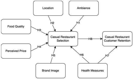 Figure 1 illustrates the conceptual framework that guides this study. The model identifies six exogenous variables—ambiance, location, food quality, perceived price, brand image, and health measures—which are hypothesized to influence casual restaurant selection and, subsequently, customer retention. These factors combine traditional service-related expectations with emergent post-COVID-19 pandemic customer concerns.