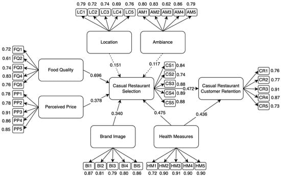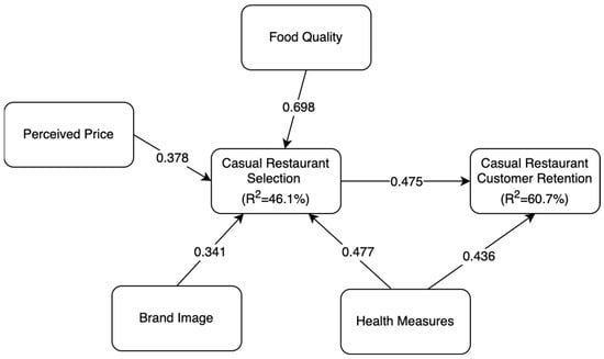 Among the key factors, health measures significantly impact both casual restaurant selection (β = 0.477, p = 0.001) and customer retention (β = 0.436, p = 0.002), highlighting the heightened importance of safety and hygiene in the post-pandemic dining environment. Additionally, brand image (β = 0.341, p = 0.035), perceived price (β = 0.378, p = 0.002), and food quality (β = 0.698, p < 0.001) were found to have significant influences on casual restaurant selection, highlighting their role in shaping customer preferences.
