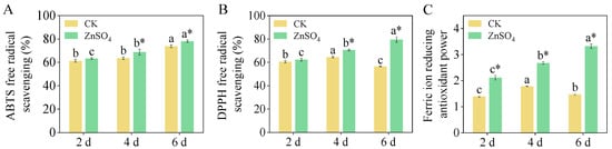 Effect of ZnSO4 stress on radical scavenging of ABTS (A), DPPH (B), and FRAP (C) of sprouts. Significant differences (p < 0.05) between different germination times under the same treatment are shown by different lowercase letters. * Indicates a significant difference (p < 0.05) between CK and ZnSO4 stress at the same time.