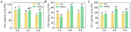 Effect of ZnSO4 stress on key enzyme activities ((A): PAL activity, (B): C4H activity, and (C): 4CL activity) in sprouts. Significant differences (p < 0.05) between different germination times under the same treatment are shown by different lowercase letters. * Indicates a significant difference (p < 0.05) between CK and ZnSO4 stress at the same time.