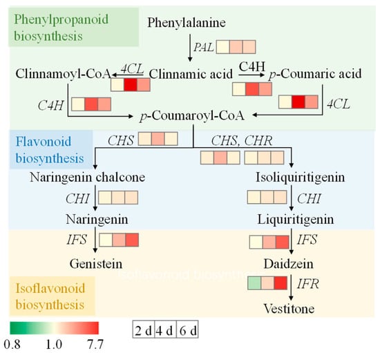 The results showed that ZnSO4 stress significantly increased the expression levels of POD, CAT, and APX in two-day-old sprouts and upregulated POD, SOD, CAT, and APX levels in four- and six-day-old sprouts (Figure 6). Among these, the effect of ZnSO4 stress on the SOD expression level in 6-day-old seedlings was the most significant, increasing by 3.4 times. In addition, the ZnSO4 treatment markedly enhanced the expression level of CHI, CHS, and CHR in two-day-old sprouts, with respective increases of 1.2-, 1.4-, and 1.2-times. In the four- and six-day-old sprouts, the relative expression levels of flavonoid-biosynthesis-related genes (PAL, C4H, CHS, 4CL, CHI, IFR, IFS, and CHR) were significantly elevated. Specifically, in the four-day-old sprouts, the ZnSO4 treatment exhibited the most pronounced effect on 4CL expression levels. Conversely, in six-day-old sprouts, IFR expression levels were most strongly induced, with respective increases of 7.7-fold and 6.3-fold compared to the control. These findings provided compelling evidence that ZnSO4 treatment enhances flavonoid biosynthesis and the antioxidant system in finger millet sprouts.