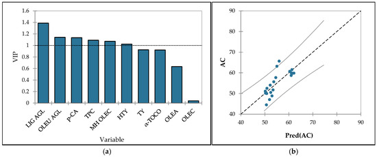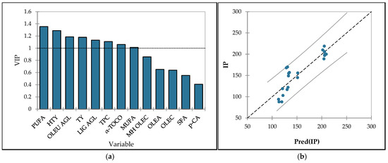 To assess the impact of variety on the measured parameters, a one-way analysis of variance (ANOVA) was conducted. Additionally, the effect of FTT temperature on each variety included in the study was also evaluated using one-way ANOVA. When a significant effect of the temperature was observed, Tukey’s post hoc test was applied to perform multiple comparisons and identify differences among the produced samples. To further explore the influence of specific components on oxidative stability and antioxidant capacity, partial least squares (PLS) regression analysis was performed. The PLS model for oxidative stability included fatty acid composition (sum of saturated fatty acids—SFAs, monounsaturated fatty acids—MUFAs, and polyunsaturated fatty acids—PUFAs) and bioactive compounds (α-tocopherol and phenolic compounds) as predictors. For the antioxidant capacity model, only bioactive compounds were used as a predictor. Variable Importance in Projection (VIP) scores were calculated to determine the most influential variables, and model performance was evaluated using the coefficient of determination (R2).