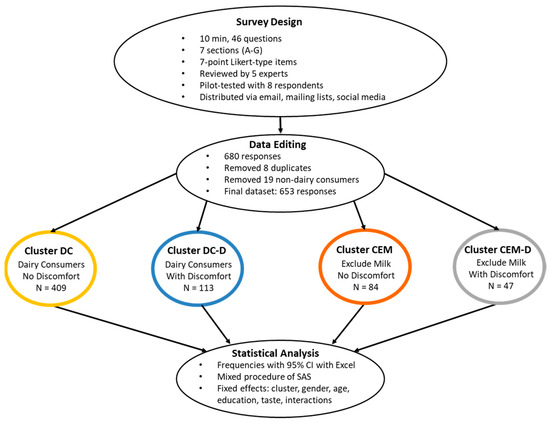 A total of 680 questionnaires were completed, but 4 pairs of potential duplicates were identified based on sociodemographic questions and specific questions less prone to change over time. All those potential duplicates were from dairy consumers who did not feel discomfort after drinking milk—which was the most numerous group—and were eliminated (n = 8). Non-dairy consumers (n = 19) were also discarded. The final dataset included 653 questionnaires grouped into 4 clusters as follows: (i) dairy consumers not feeling discomfort after drinking milk (DC; n = 409); (ii) dairy consumers feeling discomfort after drinking milk (DC-D; n = 113); (iii) dairy consumers excluding milk not feeling discomfort after drinking milk (CEM; n = 84); and (iv) dairy consumers excluding milk feeling discomfort after drinking milk (CEM-D; n = 47).