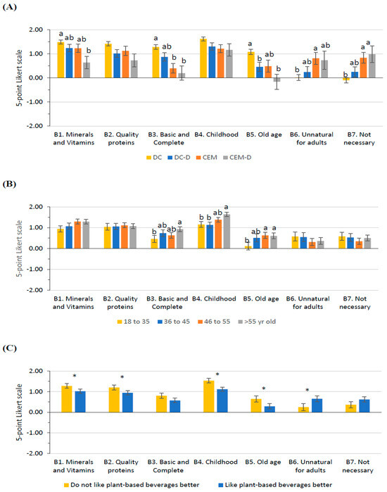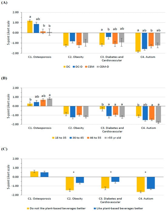 Least-square means (with SE) for Section C: Opinion on milk and health. (A) Cluster (DC, n = 409; DC-D, n = 113; CEM, n = 84; CEM-D, n = 47), (B) Age class (18–35 years old, n = 130; 36–45 years old, n = 99; 46–55 years old, n = 209; >55 years old, n = 215) and (C) (Do not like plant-based beverages better, n = 418; Like plant-based beverages better, n = 235). See Table 1 for the complete questions. Different superscript or * within the question indicates significant differences (p < 0.05) based on Tukey’s post hoc test.