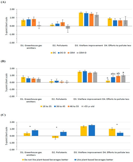 Least-square means (with SE) for Section D: Opinion on milk production and environmental impact. (A) Cluster (DC, n = 409; DC-D, n = 113; CEM, n = 84; CEM-D, n = 47), (B) Age class (18–35 years old, n = 130; 36–45 years old, n = 99; 46–55 years old, n = 209; >55 years old, n = 215), and (C) (Do not like plant-based beverages better, n = 418; Like plant-based beverages better, n = 235). Different superscript or * within the question indicates significant differences (p < 0.05) based on Tukey’s post hoc test.