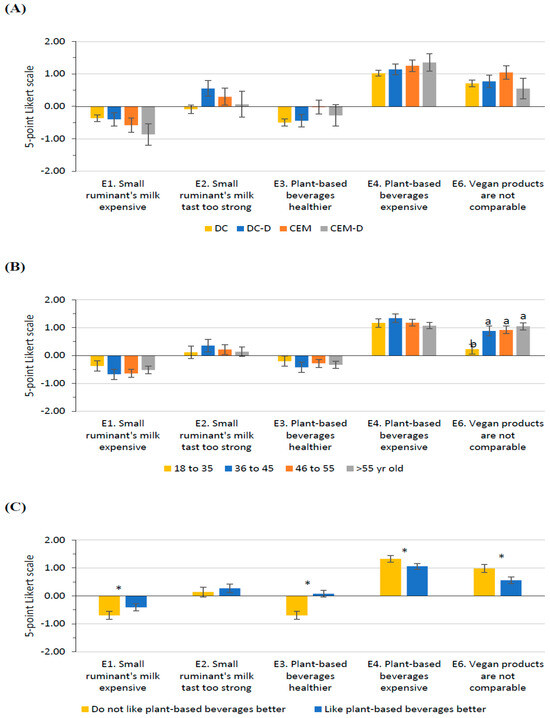 Least-square means (with SE) for Section E: Opinion on alternatives to cow milk. (A) Cluster (DC, n = 409; DC-D, n = 113; CEM, n = 84; CEM-D, n = 47), (B) Age class (18–35 years old, n = 130; 36–45 years old, n = 99; 46–55 years old, n = 209; > 55 years old, n = 215), and (C) (Do not like plant-based beverages better, n = 418; Like plant-based beverages better, n = 235). Different superscript or * within the question indicates significant differences (p < 0.05) based on Tukey’s post hoc test.