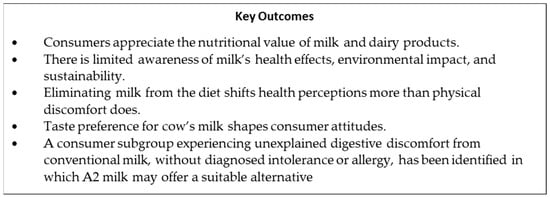 This study focused on the perception of dairy consumers regarding milk’s nutritional characteristics, its impact on human health, aspects related to its production, and substitutes for cow milk. A summary of the key results of this study is shown in Figure 6.