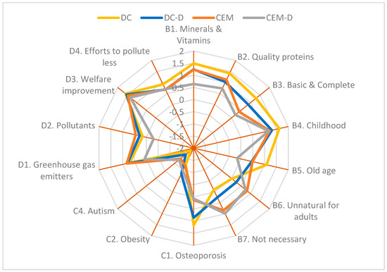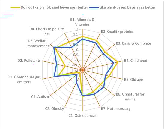 All clusters disagreed with milk consumption being related to a higher risk of obesity (QC2), diseases such as diabetes or cardiovascular problems (QC3), and autism (QC4). Related to the higher risk of obesity (QC2), the disagreement was stronger for those who did not like plant-based beverages better than milk for clusters DC-D (Do not like plant-based beverages better, −1.16 ± 0.19; Like plant-based beverages better, −0.50 ± 0.21; p = 0.043) and CEM (Do not like plant-based beverages better, −1.84 ± 0.31; Like plant-based beverages better, −0.56 ± 0.24; p = 0.001). Regarding the increased risk of diseases such as diabetes or cardiovascular problems (QC3), there was also a stronger disagreement among those who did not like plant-based beverages better than milk for clusters DC (Do not like plant-based beverages better, −1.44 ± 0.11; Like plant-based beverages better, −0.92 ± 0.15; p = 0.048) and CEM (Do not like plant-based beverages better, −1.76 ± 0.34; Like plant-based beverages better, −0.41 ± 0.27; p = 0.002). Regarding the increased risk of autism in children (QC4), a stronger disagreement was observed for those who did not like plant-based beverages better than milk for CEM-D (Do not like plant-based beverages better, −1.72 ± 0.31; Like plant-based beverages better, −0.74 ± 0.25; p = 0.024). In CEM-D, that disagreement was even stronger for older (55 years old, −2.0 ± 0.27) than younger participants (18 to 35 years old, −0.27 ± 0.46; 46 to 55 years old, −1.16 ± 0.29: p < 0.05). In addition, among younger participants, those belonging to cluster DC (−1.85 ± 0.12) disagreed much more with this statement than those in cluster CEM (−0.92 ± 0.23; p = 0.026). Moreover, among participants who preferred the taste of plant-based alternatives, those from the DC cluster (−1.79 ± 0.10) disagreed more strongly with this statement than those from cluster CEM-D (p = 0.003).