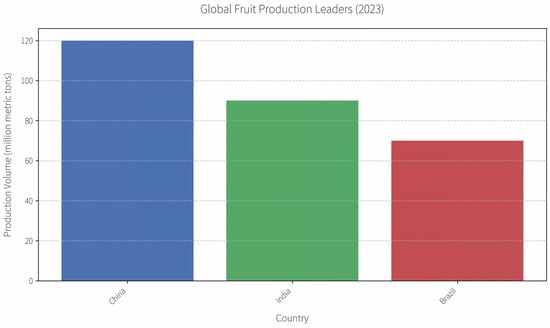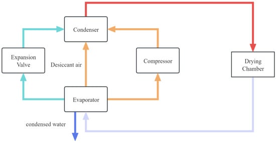 China is a major producer of fruits and vegetables (Figure 1), with an annual yield of 299.7 million tons of fruits [1]. However, the annual economic losses caused by fruit and vegetable corruption reached 13.94 billion dollars in 2024 [2]. Fruit and vegetable drying is a significant part of the food drying industry because it effectively extends the shelf life of fruits and vegetables, which enhances product value and increases farmers’ income. The main objectives of food drying are to preserve food by reducing water activity, decrease weight and volume, transform food into a more convenient form for storage, packaging, transportation, and/or use, and provide food with certain desirable characteristics, such as a distinct flavor, crunchiness, chewiness, among others [3]. The drying process of food products prevents microbial contamination and chemical changes such as enzymatic and non-enzymatic browning, extends storage life, and reduces packaging, handling, and transportation costs [4]. Among the various food drying technologies available, heat pump drying is widely used. Heat pump technology is considered to be a promising method for drying materials due to its high drying efficiency, high specific water extraction rate, and low investment cost [5]. Its fundamental principle is based on the reverse Carnot cycle, in which a small amount of electric energy is used to transfer heat from a low-temperature heat source to a high-temperature heat source. As hot air passes through the drying chamber, it absorbs moisture from the material, resulting in humidified air (Figure 2). This hot and humid air then enters the evaporator, where the refrigerant absorbs its heat and undergoes a phase change from liquid to gas. Consequently, the hot and humid air is cooled to its dew point, and moisture is condensed and removed. The gaseous refrigerant is compressed by the compressor and subsequently condensed back into a liquid phase. The heat released from this process reheats the air, which is then recirculated back into the drying chamber for continuous recycling [6].