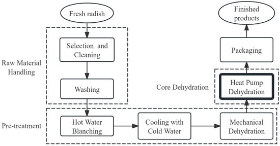 Single heat pump drying technologies create relatively low-temperature and controlled-humidity environments within drying chambers. They are able to dry heat-sensitive fruits and vegetables because the moisture migration rate on the surfaces of such fruits and vegetables reflects their internal mobility rate. Single heat pump drying also uses less energy consumption than traditional coal-fired drying, is a more convenient method for temperature control, and offers a high degree of automation. For example, dried radish, which retains a high nutritional value [13], can be processed using a single heat pump as follows (Figure 3):