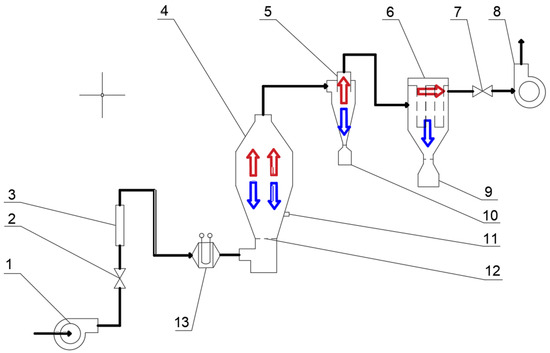 Schematic diagram of heat pump fluidized bed drying [52]. (1) Blower; (2,7) Regulating valves; (3) Gas rotameter; (4) Fluidized bed dryer; (5) Cyclone separator; (6) Bag filter; (8) Induced draft fan; (9,10) Collection tank; (11) Sampling port; (12) Gas distribution plate; (13) Electric heater. Notes: The red arrows indicate the direction of hot air flow, while the blue arrows represent the direction of cold air flow.