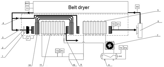 Diagram of a heat pump dehumidifying drying device [59]. (1) Heater; (2) Heat exchanger; (3,4) Regulating valves; (5) Condenser; (6) Feed conveyor belt drive motor; (7) Dehumidifying fan; (8) Compressor; (9) Expansion valve; (10) Evaporator; (11) Condenser; (12) Condensation pipe; RH1 = Feed inlet; T1, T2, T3, and T4 = temperature sensors; P, P1, P2, P3, and P4 = pressure sensors.