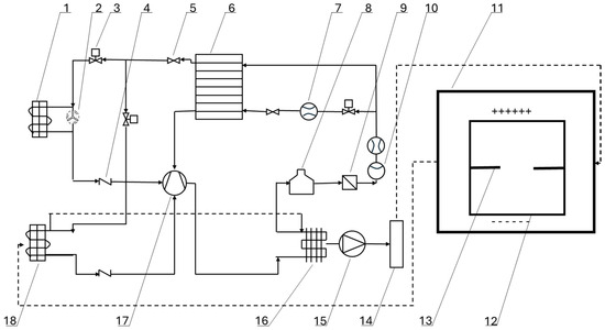 Schematic diagram of a high-pressure electric field–heat pump combined drying system [65]. (1) Outdoor evaporator; (2) External fan; (3) Solenoid valve; (4) Check valve; (5) Electronic expansion valve; (6) Economizer; (7) Mass flowmeter; (8) Liquid receiver; (9) Drying filter; (10) Sight glass; (11) Drying chamber; (12) High-voltage electric field plate; (13) Material tray; (14) Electric heating; (15) Circulating fan; (16) Condenser; (17) Compressor; (18) Indoor evaporator.