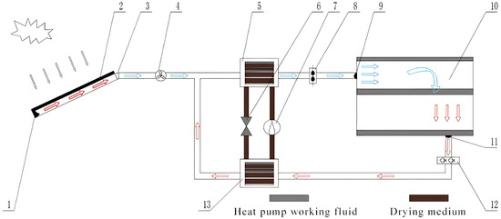 Solar-assisted heat pump drying system [76]. (1) Air intake; (2) Heat collector; (3) Air intake duct; (4) Centrifugal fan; (5) Condenser; (6) Throttle valve; (7) Compressor; (8) Supply fan; (9) Air inlet; (10) Drying room; (11) Air outlet; (12) Exhaust fan; (13) Evaporator.