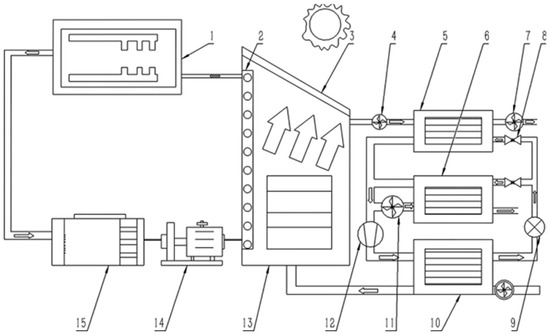 Schematic diagram of a solar–air heat source drying system [79]. (1) Evacuated tube collector; (2) Hot water radiation panel; (3) Metal absorption plate; (4) Bypass exhaust fan; (5) Evaporator no. 1; (6) Dryer no. 2; (7) Exhaust fan; (8) Solenoid valve; (9) Expansion valve; (10) Condenser; (11) Induced draft fan; (12) Compressor; (13) Drying chamber; (14) Water pump; (15) Water storage pipe.