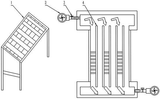 New double-pass vacuum tube solar air collector [82]. (1) New-type collector; (2) Induced draft fan; (3) Flow meter; (4) Vacuum double-pass glass tube with a heat absorption coating.