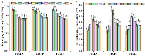 Changes in the content of bound phenols (A) and free phenols (B) in bamboo shoots during the fermentation process of LAB. The different letters on the bar chart indicate significant differences in the content of bound phenols and free phenols between the same sample and different fermentation times, with p < 0.05.